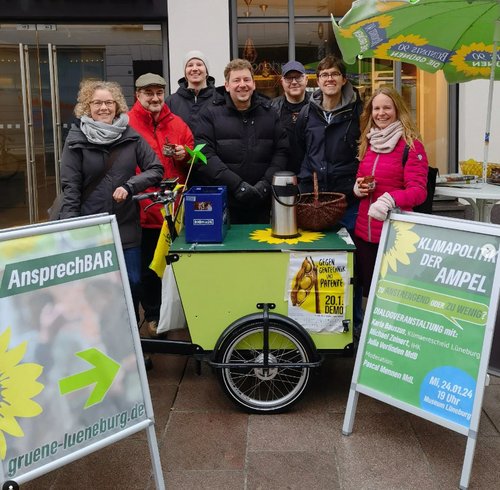 Bereit zum Gespräch, offen für Kritik und Anregungen: Auch im Februar stehen wir mit unserer ansprechBar in der Großen Bäckerstraße in der Lüneburger Fußgängerzone zum Schnack bereit. Dazu gibt es gern ein Tässchen unseres leckeren, hausgemachten Punschs (alkoholfrei) und was zu knabbern. Von 12-13 Uhr ist auch die stellvertretende Vorsitzende der Grünen im Bundestag, Dr. Julia Verlinden, an der Bar.