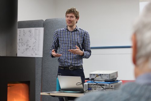 Im Kern der Veranstaltung stand anschließend die Vorstellung des Geschäftsmodells von Solardarity. In ihrem Vortrag erklärten die Studierenden, dass ein zentraler Baustein der Nießbrauchvertrag zwischen Solarmodulhersteller und den Kundinnen und Kunden ist. Damit bleibt das Eigentum der Solarmodule über eine fixierte Vertragslaufzeit beim Hersteller, während der Abnehmer vom Service der Stromeinspeisung anstatt der Verantwortung über die Materialien der Solarmodule profitiert. Auch Wartungs- und Reparaturarbeiten sind durch das permanente Eigentum beim Hersteller für Kundinnen und Kunden vereinfacht. Ein weiteres wichtiges Merkmal ist die Kombination von Solarmodulen und Dachbegrünung, da hier wirksame Kopplungseffekte entstehen. Beispielweise trägt die Dachbegrünung zur Kühlung des Daches und der Gebäudehülle bei und steigert die Leistung der Solarzellen um bis zu 7%. Außerdem entstehen Habitate unter anderem für Insekten und Vögel auf den Dächern. Solargründächer leisten damit nicht nur einen Beitrag zur Energiewende, sondern bekämpfen auch die Krise der sinkenden Artenvielfalt in Deutschland.