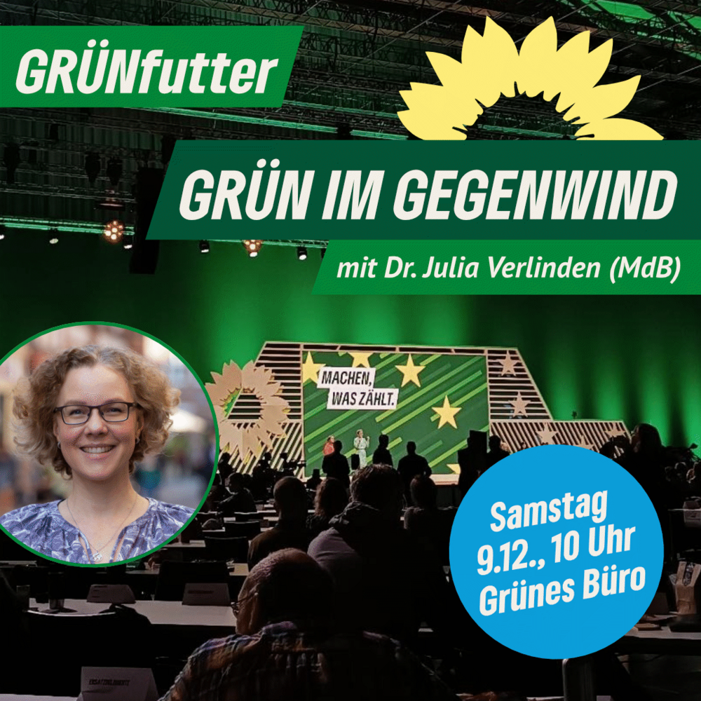 Das wollen wir diskutieren bei unserem Dezember-Grünfutter mit unserer Bundestagsabgeordneten Julia Verlinden, am 9. Dezember um 10 Uhr im Grünen Büro in Lüneburg, Schröderstraße 16 (im Hof), 21335 Lüneburg.