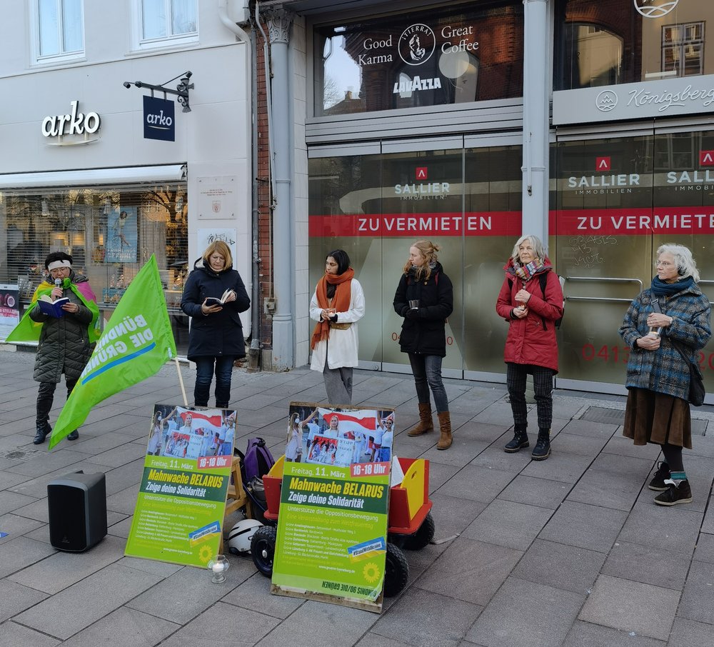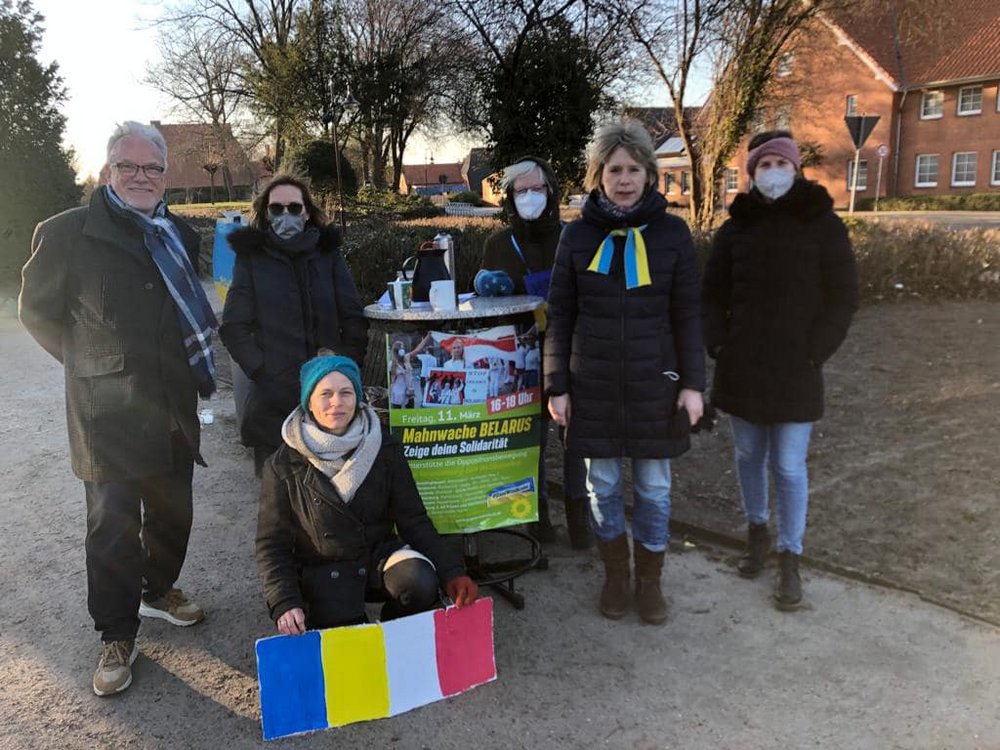 Als besondere Aktion im Rahmen des Weltfrauentages haben mit einer Mahnwache sechs Ortsverbände der GRÜNEN ihre Solidarität mit der Oppositionsbewegung in BELARUS bekundet. Zur gleichen Zeit von 16.00 -18.00 Uhr wurden an den Mahnwachen in Amelinghausen, Bardowick, Bleckede, Dahlenburg, Gellersen und der Stadt Lüneburg Kerzen und Feuerschalen angezündet, um Menschen, die sich für Demokratie, freie Meinung und Menschenrechte in BELARUS einsetzen, zu unterstützen. „Besonders Akteur*innen, die inhaftiert sind wollten wir mit dieser Aktion hier aus Niedersachsen Mut machen“, betont die Initiatorin Peggy Hasselmann. Über das Aktionsbündnis 100xsolidaritaet.de wurden an den Ständen Briefe an Inhaftierte geschrieben und Informationsmaterial von Amnesty International verteilt. Amnesty setzt sich besonders für das Menschenrechtszentrum Viasna mit Sitz in Minsk ein und vernetzt mit der Gruppe amnesty-belarus-ukraine.de übergreifend Akteur*innen dieser beiden Staaten.