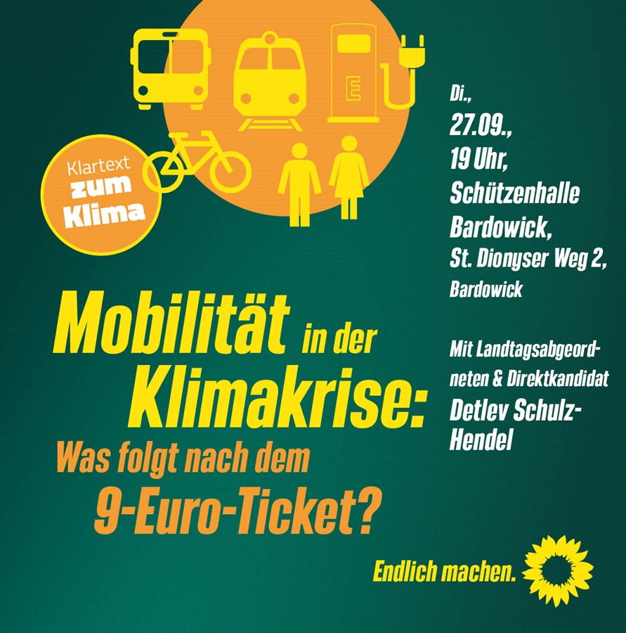 Im Rahmen eines Bürger*innendialogs tauscht sich Detlev Schulz-Hendel am Dienstag, 27. September, um 19 Uhr in der Schützenhalle Bardowick (St. Dionyser Weg 2) mit allen Interessierten über mögliche Nachfolgeregelungen des 9-€-Tickets aus.
