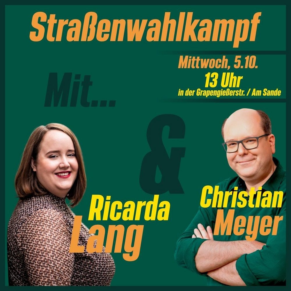 Die Grünen in Stadt und Landkreis hoffen, in allen drei Wahlkreisen die Direktmandate holen zu können und zeigen in diesem Wahlkampf wieder viel Präsenz. Prominente Unterstützung kommt in der Woche vor dem Wahlsonntag aus Berlin und Hannover. Am Mittwoch, dem 5. Oktober um 13 Uhr kommen Ricarda Lang, Bundesvorsitzende von BÜNDNIS 90/DIE GRÜNEN, und Christian Meyer, Spitzenkandidat der Grünen Niedersachsen zur Landtagswahl, zum Bürgerdialog in die Grapengießerstraße / Am Sande. Mit dabei sind auch die Kandidaten der Wahlkreise Lüneburg-Stadt, Pascal Mennen und Lüneburg-Land, Detlev Schulz-Hendel und stehen für Fragen und Gespräche zur Verfügung. Am Samstag, 8. Oktober, besucht dann die Bundesfamilienministerin Lisa Paus die Hansestadt.