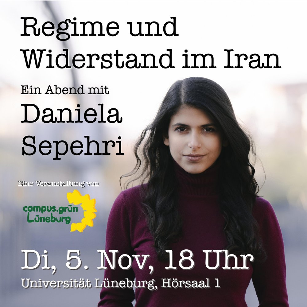 Am 5.11.24 fand im Hörsaal 1 der Leuphana Universität die Veranstaltung zum Thema „Regime und Widerstand im Iran“ statt. Referentin war Daniela Sepehri aus Berlin, eine 26-jährige Studentin, Aktivistin, Journalistin, Influencerin und Poetry-Slammerin. Sie gehört zum engsten Kreis des deutschen Widerstandes gegen das iranische Terrorregime. Sie ist Mitinitiatorin des Patenschaftsprogramm, demzufolge Bundestagsabgeordnete Patenschaften für politische Gefangene übernehmen, damit die Forderung nach Freilassung eine höheren Grad an Öffentlichkeit erreicht. In die innersten Schrecknisse ist sie so gut vernetzt, dass sie uns von schlimmen Leiden berichtete, z.B. dass Jugendlichen Finger einer Hand abgehackt worden war, weil man sie des Diebstahl bezichtigt hatte oder dass eine 16-Jährige sich vom Dach eines Hochhauses in den Tod gestürzt hatte, nachdem das Tragen einer Jeans von der Sittenpolizei angezeigt worden war. Die letztgenannte Nachricht stammte vom Tag der Veranstaltung. Die 100 Anwesenden waren zutiefst betroffen und hatten die Möglichkeit, ihre Gefühle und Fragen an Daniela zu richten. So wurde gefragt wie sie als Aktivistin die Horrornachrichten verarbeitet, es wurde gefragt warum die Bundesregierung so passiv ist und die deutschen Geiseln nicht befreit bekommt, es wurde gefragt, was passieren müsste, damit das Regime wirklich Schaden nehmen würde. Hier war die Antwort klar und deutlich: Die Revolutionsgarden auf die Terrorliste der EU zu setzen, würde das Regime in seinen Grundfesten erschüttern.