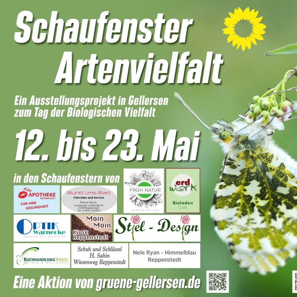 Die Aktion ist ein Ausstellungsprojekt der Grünen Gellersen. Diese werden am Montag, 22. Mai, mit einem Stand ab 15 Uhr in Reppenstedt über das Thema Biologischen Vielfalt informieren. Es gibt Infomaterial zum Thema sowie Samentütchen, um auch auf Balkon oder im eigenen Garten die Lebensbedingungen der Insektenwelt zu verbessern. Standort: Parkplatz am Wiesenweg.