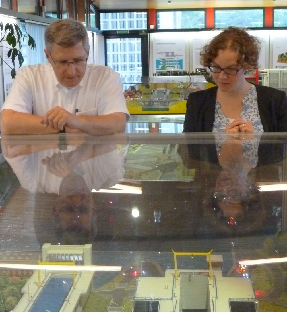 Für 15 Personen begann die Veranstaltung bereits zwei Stunden früher mit einem abenteuerlichen Ausflug durch das Innere des Schiffshebewerks. Zuerst wurde an Hand der Modelle im Informationszentrum die Funktionsweise des Gebäudes erläutert. Anschließend erfolgte mit fachkundiger Führung eine Besichtigung des Bauwerks. Es ging über Leitern, steile Treppen und schmale Stege zum "Trog" und hier weiter zusammen mit einem Schiff 60m in die Höhe. Das Ganze wurde durch Starkregen zu einer Herausforderung für alle Beteiligten. Gut zu wissen, dass unsere Bundestagskandidatin, Dr. Julia Verlinden, auch hier eine gute und souveräne Vorstellung ablieferte.