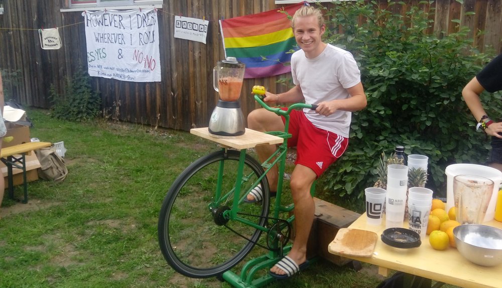 Lukas Tohoff, während seines Studiums in Lüneburg aktives Mitglied der GRÜNEN JUGEND, ist nach Kiel gezogen und hat sein tolles Smoothiefahrrad mitgenommen. Lukas hatte es selbst zusammengebaut, um auf diversen Festivals, aber auch an den Infoständen der GJ in der Fußgängerzone Smoothies herzustellen. Ein Supergerät, dass neben der Herstellung von leckeren Smoothies auch immer für Aufsehen und Staunen sorgte.