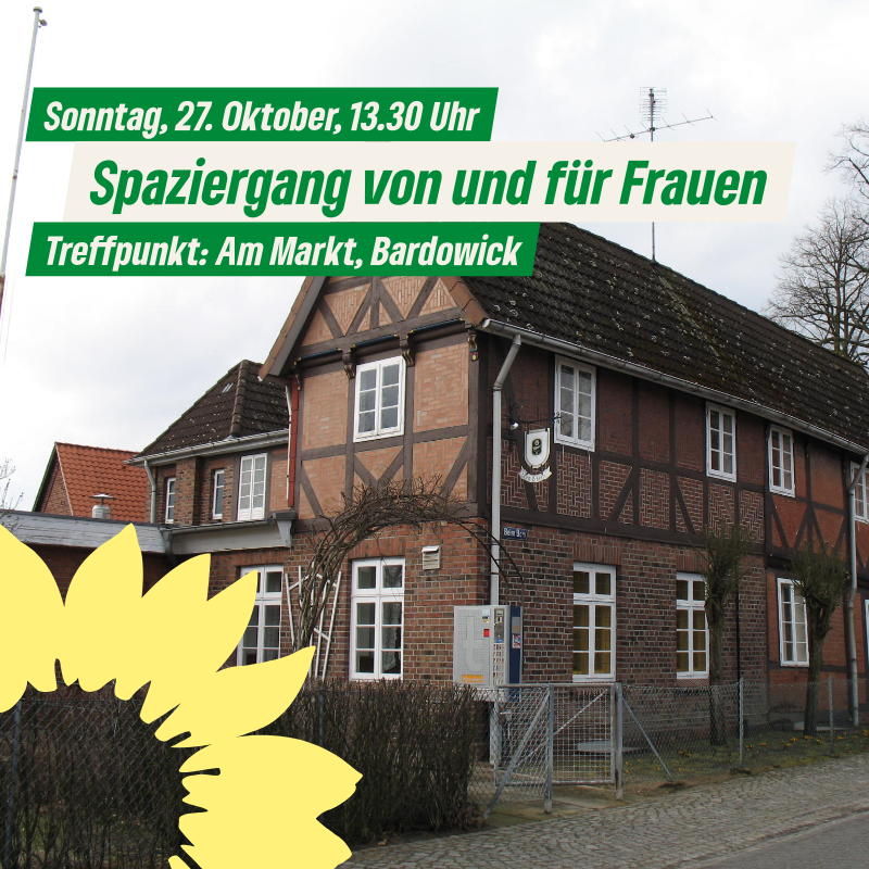 Am 27.10. findet in Bardowick ein Spaziergang der Grünen von und für Frauen statt. Dabei können wir uns (besser) kennenlernen, miteinander über verschiedene Themen ins Gespräch kommen und Bardowick entdecken. Der Spaziergang beginnt um 13.30 Uhr am Markt und endet dort gegen 15.00 Uhr. Wer mag, komme anschließend gerne mit ins Mühlencafé, wo die Veranstaltung gemütlich mit Kaffee und Kuchen ausklingt. Eine Anmeldung ist nicht erforderlich.