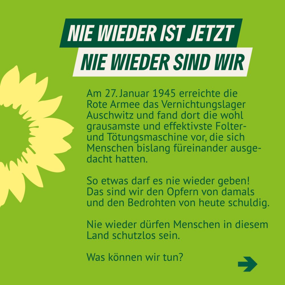 Dabei nicht müde zu werden, ist uns Verpflichtung, denn Jahre bevor Juden, polnische und sowjetische Kriegsgefangene, Roma, Sinti, Menschen mit Behinderungen, queere und politische Häftlinge im industriellen Maßstab ermordet wurden, hatten die Deutschen sich entschieden, ihr Schicksal in die Hände von Nationalisten, Schwurbler*innen, Verschwörungsgläubigen und Rassist*innen zu legen. Dieser Fehler darf sich nicht wiederholen. Das sind wir den Opfern von damals und den Bedrohten von heute schuldig. Nie wieder dürfen Menschen in diesem Land schutzlos sein.