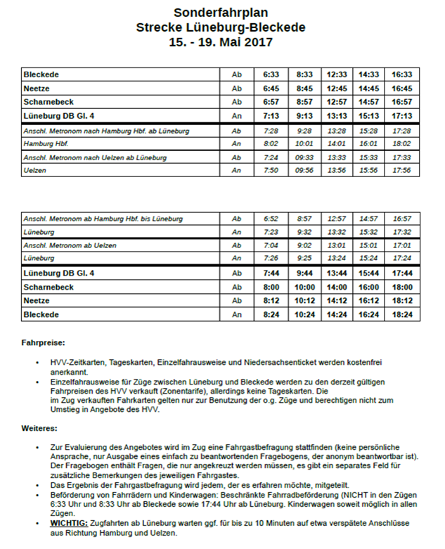 Am Dienstag, 16. Mai, reisen wir als Zeichen unserer Unterstützung mit. (6.33h Bleckede, 6.45h Neetze, 6.57h Scharnebeck und 7.13h Lüneburg).