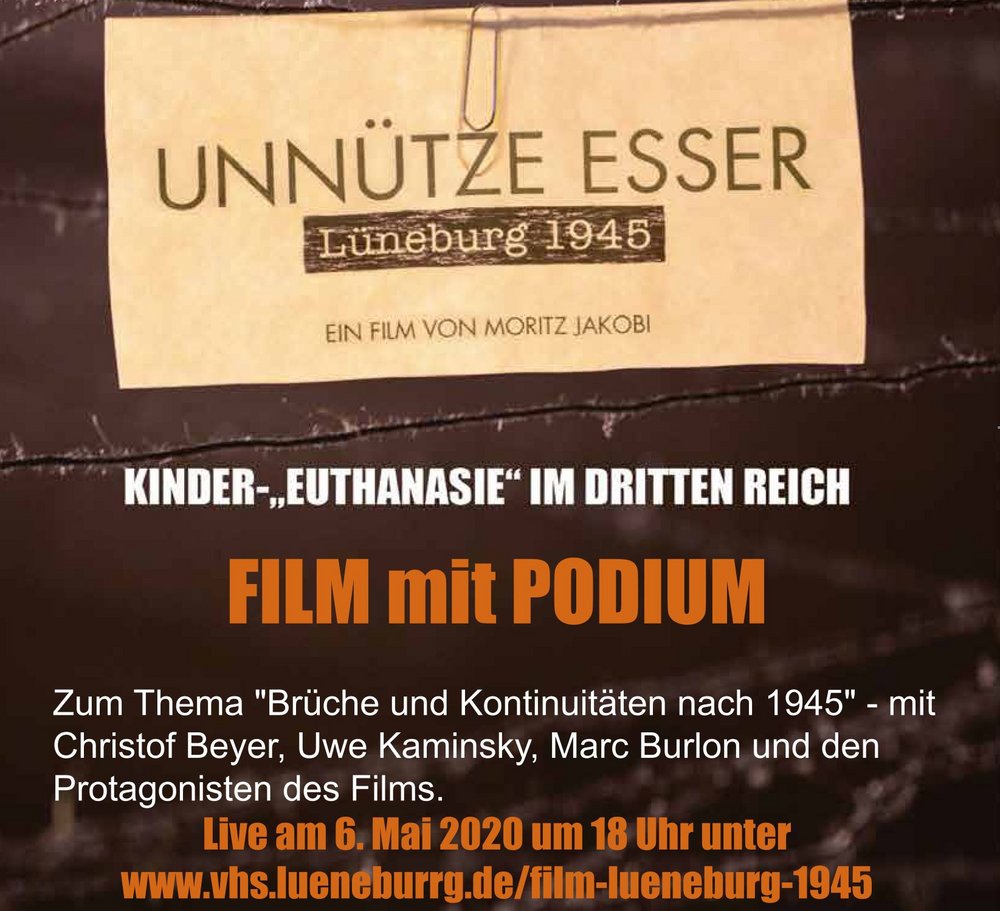 Der 32-minütige Film wird am Mittwoch, 6. Mai 2020, um 18 Uhr live auf www.vhs.lueneburg.de/film-lueneburg-1945 zu sehen sein. Im Anschluss diskutieren Dr. Christof Beyer (Medizinhistoriker aus Kiel/Berlin), Dr. Uwe Kaminsky (Historiker der Ruhr-Universität Bochum), Dr. Marc Burlon (Ärztlicher Direktor der Psychiatrischen Klinik Lüneburg) und Friedrich Buhlrich (Angehöriger von Opfern der Lüneburger Kinder-»Euthanasie«) unter Moderation von Dr. Carola S. Rudnick (Leiterin der »Euthanasie«-Gedenkstätte Lüneburg) im Livestream, welche Kontinuitäten und Brüche es nach 1945 in der Psychiatrie, Jugendfürsorge und Behindertenarbeit gegeben hat.