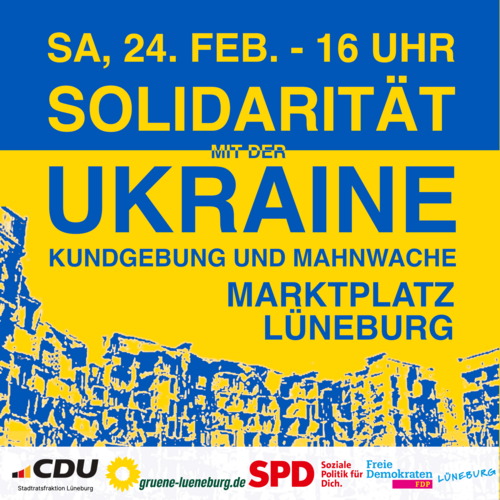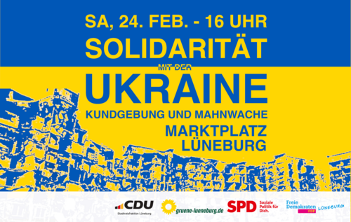 Wir rufen daher zu einer Demonstration der „Solidarität mit der Ukraine“ auf, am Samstag, dem 24. Februar 2024, um 16 Uhr auf dem Marktplatz vor dem Lüneburger Rathaus.