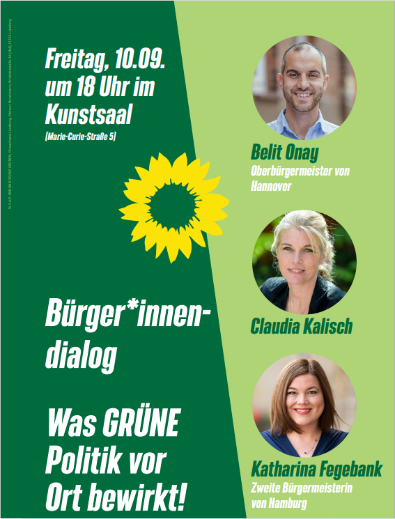 Diese und andere Fragen möchten wir gemeinsam mit euch am Freitag vor der Kommunalwahl diskutieren. Mit dabei Claudia Kalisch, grüne Oberbürgermeisterkandidatin in Lüneburg, Belit Onay, erster grüner Oberbürgermeister in Hannover, und Katharina Fegebank, zweite Bürgermeisterin von Hamburg.