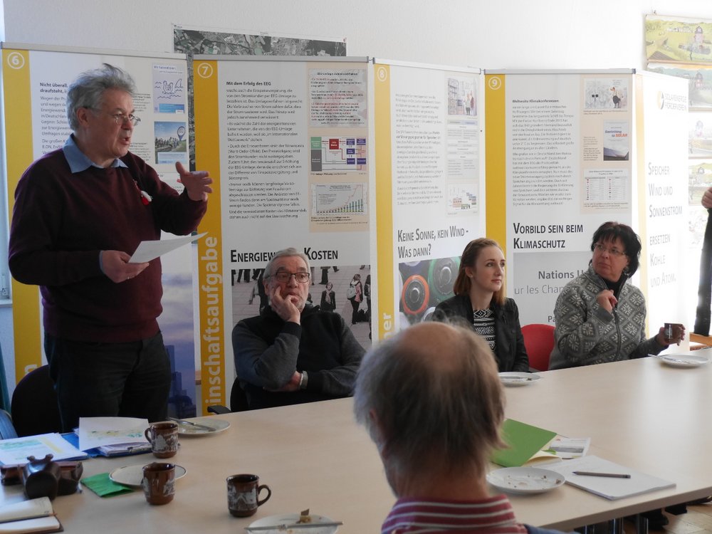 Das Eröffnungsreferat hält Tomas Biermann-Kojnov, Vorsitzender des Lüneburger Vereins SunOn. Der Verein berät Interessierte in der Region Lüneburg rund um das Thema Solarkraftwerke in Bürgerhand. Entlang der insgesamt zehn Ausstellungstafeln erläutert er die Bedeutung des EEG für die Entwicklung der Photovoltaik in Deutschland und wie ein komplett neuer Industriezweig mit vielen Arbeitsplätzen entstanden ist.