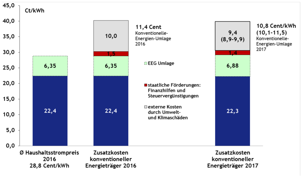 Das Ergebnis überrascht Experten nicht. Es ist dennoch bemerkenswert, wie deutlich der volkswirtschaftliche Vorteil der Erneuerbaren ausfällt: "Die Wissenschaftler berechneten aus den sogenannten 'externen' Kosten durch Umwelt- und Klimaschäden sowie staatlichen Förderungen eine 'konventionelle Energien-Umlage' von 11,4 Cent je Kilowattstunde für das Jahr 2016. Demgegenüber steht die EEG Umlage mit 6,792 Cent recht günstig da, oder?"