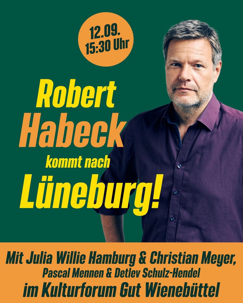 Achtung: Robert Habeck musste leider kurzfristig absagen. Unsere Veranstaltung wird dennoch wie geplant stattfinden, es wird ein spannender Austausch mit unseren Spitzenkandidat*innen für die Landtagswahl, Julia Willie Hamburg und Christian Meyer, sowie mit unseren lokalen Kandidaten für den Landtag, Pascal Mennen und Detlev Schulz-Hendel.