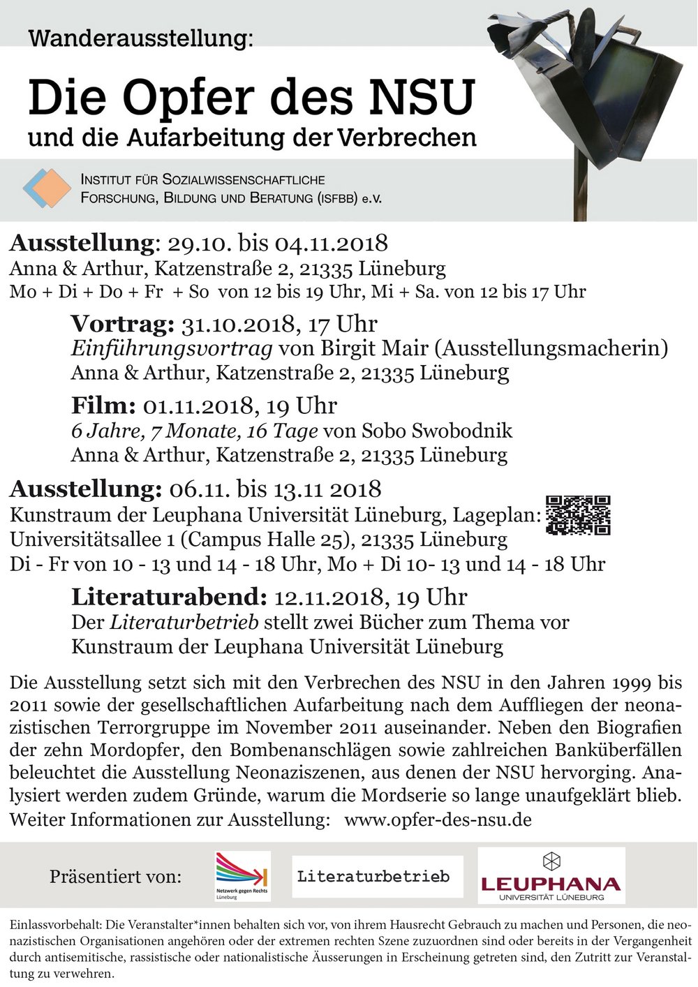 - Am 12. November folgt dann noch ein Literaturabend. Der Literaturbetrieb stellt zwei Bücher zum Thema vor: 19 Uhr im Kunstraum der Universität Lüneburg Universitätsallee 1 (Campus Halle 25), 21335 Lüneburg