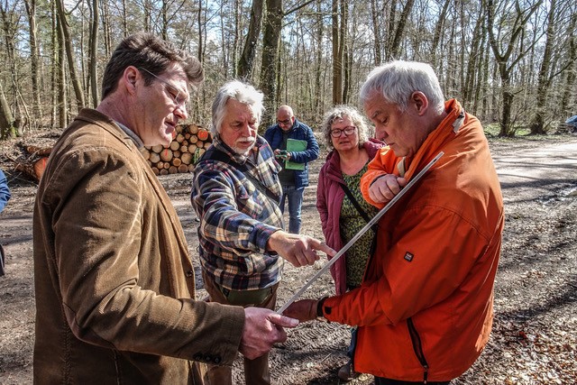 Vor Ort erläuterte Dr. Heinz Klöser vom BUND den Anwesenden, darunter Detlev Schulz-Hendel, verkehrspolitischer Sprecher der Grünen im niedersächsischem Landtag, die Vor- und Nachteile der einzelnen Trassenvarianten.