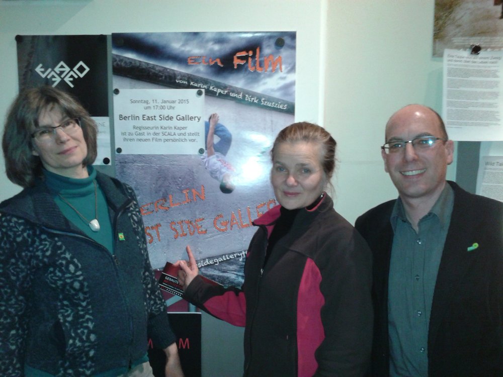 Es war ein rundum gelungener Abend. Die Regisseurin und Produktionsleiterin Katrin Kaper lud den Kreisvorstand von „B90/ Die Grünen Lüneburg“ zum Filmstart ihres Dokumentarfilms „East Side Gallery“ am Sonntag ins Scala Programmkino ein. Petra Kruse-Runge als Fraktionsvorsitzende der Kreistagsfraktion und im Kreisvorstand sowie Oliver Kraemer als Kreisvorstandsprecher erlebten einen spannenden, informativen und zum Teil recht nachdenklichen Film über das Berliner Kulturprojekt „East Side Gallery“. Durch die geplante Bebauung im direkten Umfeld droht dem weltweit bekannten Symbol der Freiheit und der Menschenrechte das kulturelle Aus in seiner heutigen Form.