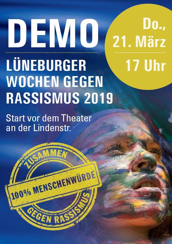 Wir rufen auf, lautstark gegen Rassismus am 21. März 2019 an der Demonstration in der Lüneburger Innenstadt teilzunehmen. Um 17:00 treffen wir uns vor dem Theater an der Lindenstraße.