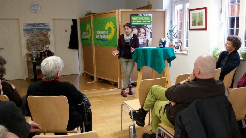 Filiz Polat, Fraktionssprecherin und flüchtlingspolitische Sprecherin der Landtagsfraktion, spannte mit ihrem Eingangsvortrag einen weiten Bogen "Zuwanderung in Deutschland, gestern und heute". Danach wurde angeregt diskutiert. Auch die Frage zum Verhältnis Umweltschutz und Wohnungsneubau für Flüchtlinge war dabei Thema.