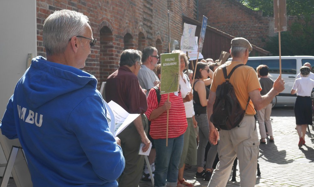 Kurzfristig hatten sich BUND, NABU und Grüne zu einer spontanen Kundgebung vor Beginn der Ratssitzung verabredet. Dort stand die geplante Bebauung des Grüngürtels West zwar nicht aktuell auf der Tagesordnung, doch der Bauausschuss des Rates hatte am Montag mit den Stimmen von SPD, CDU und AfD beschlossen, das eilig vorangetriebene Projekt der Verwaltung in den Planungsprozess zu bringen.