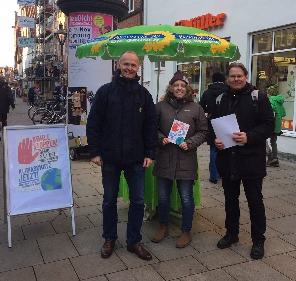 Am Samstag, 17.11.2018, hatten die GRÜNEN einen Stand in der Grapengießerstrasse in Lüneburg eingerichtet, um auf eine Demonstration zum Thema „Kohle stoppen! Klimaschutz Jetzt!“ am 1. Dezember 2018 in Berlin bzw. Köln aufmerksam zu machen.