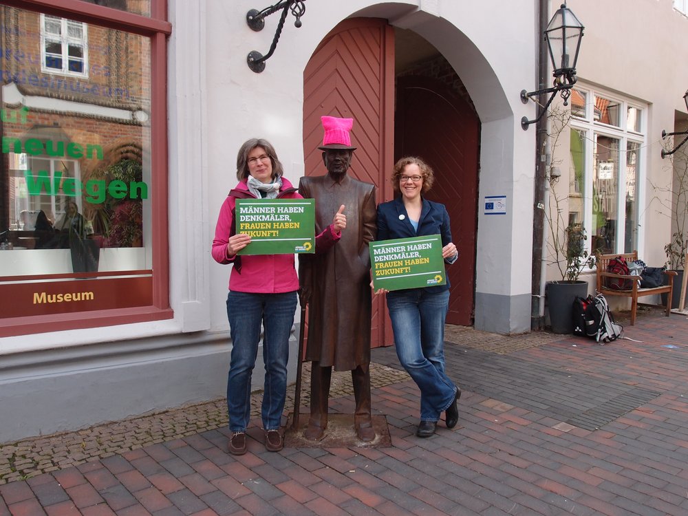 Petra Kruse-Runge (GRÜNE Fraktionsvorsitzende im Kreistag Lüneburg) und Dr. Julia Verlinden MdB (GRÜNE Bundestagsabgeordnete aus Lüneburg) mit den typischen rosa „Pussy-Hats“ der weltweiten Frauenbewegung und der Botschaft „Männer haben Denkmäler, Frauen haben Zukunft!“ (v.l., Foto: Marie Neuhaus)