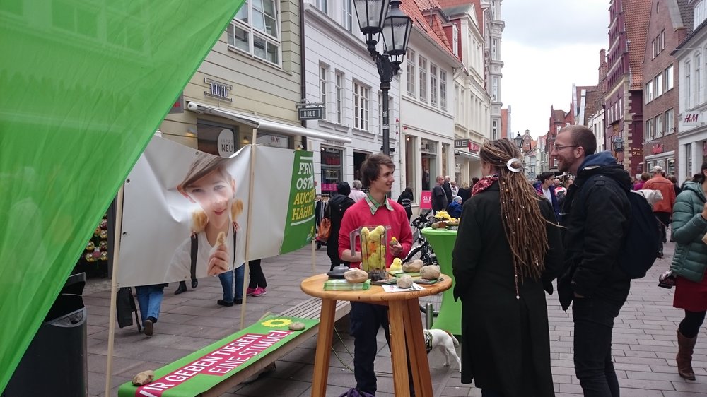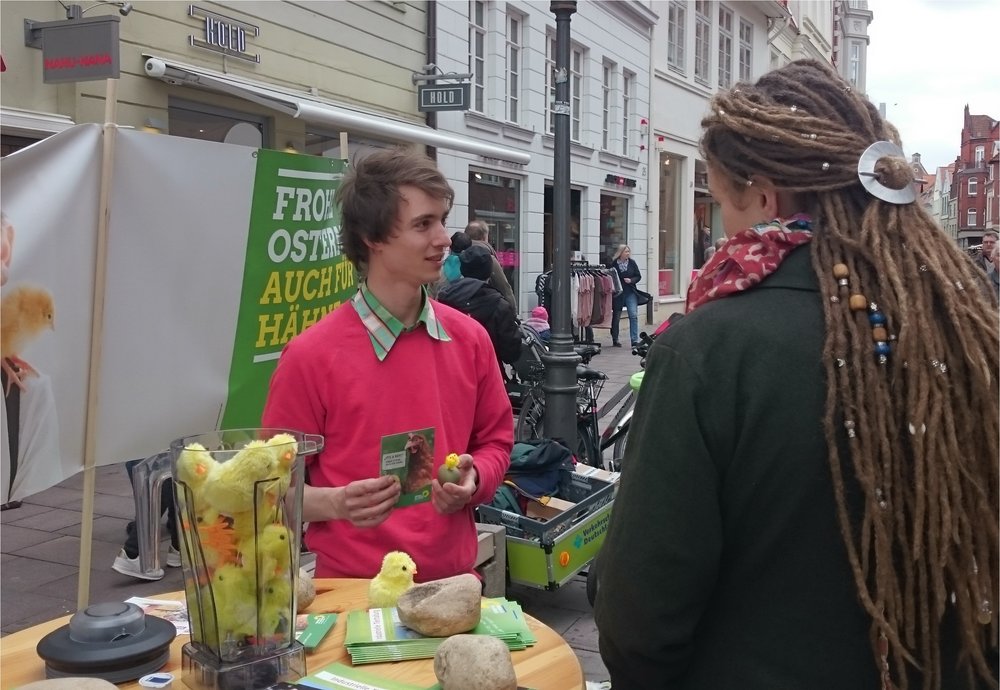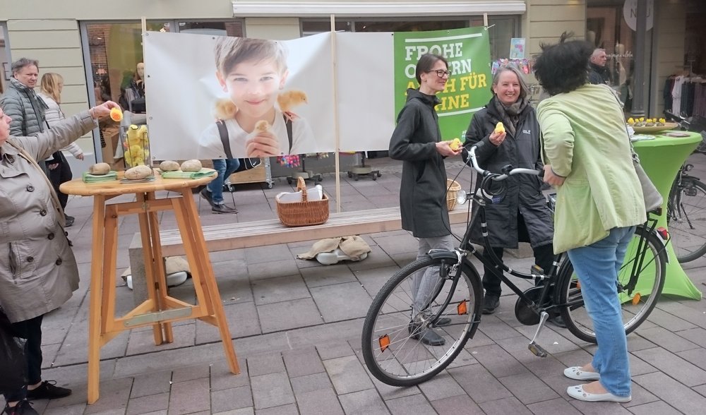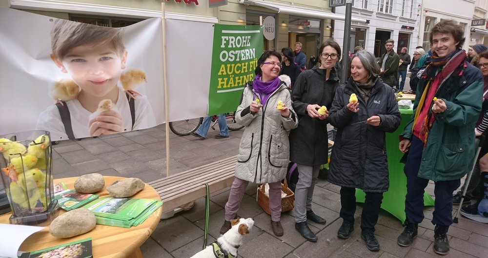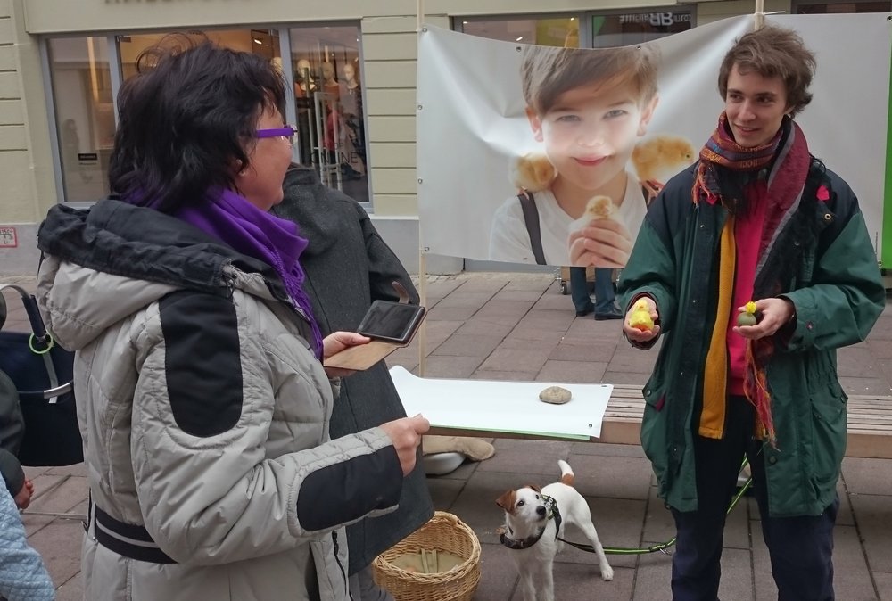 Zu Ostern schmecken alle Eier gut und damit es möglichst viele gibt, ist es schon lange gängige Praxis männliche Küken nach dem Schlüpfen zu identifizieren und dann durch Vergasen oder Schreddern zu vernichten. Denn sie sind in der Eierproduktion und der Hähnchenmastproduktion nicht zu gebrauchen. Auf diesen leidvollen Umgang mit den männlichen Küken haben die GRÜNEN durch einen ins Auge fallenden Infostand aufmerksam gemacht: