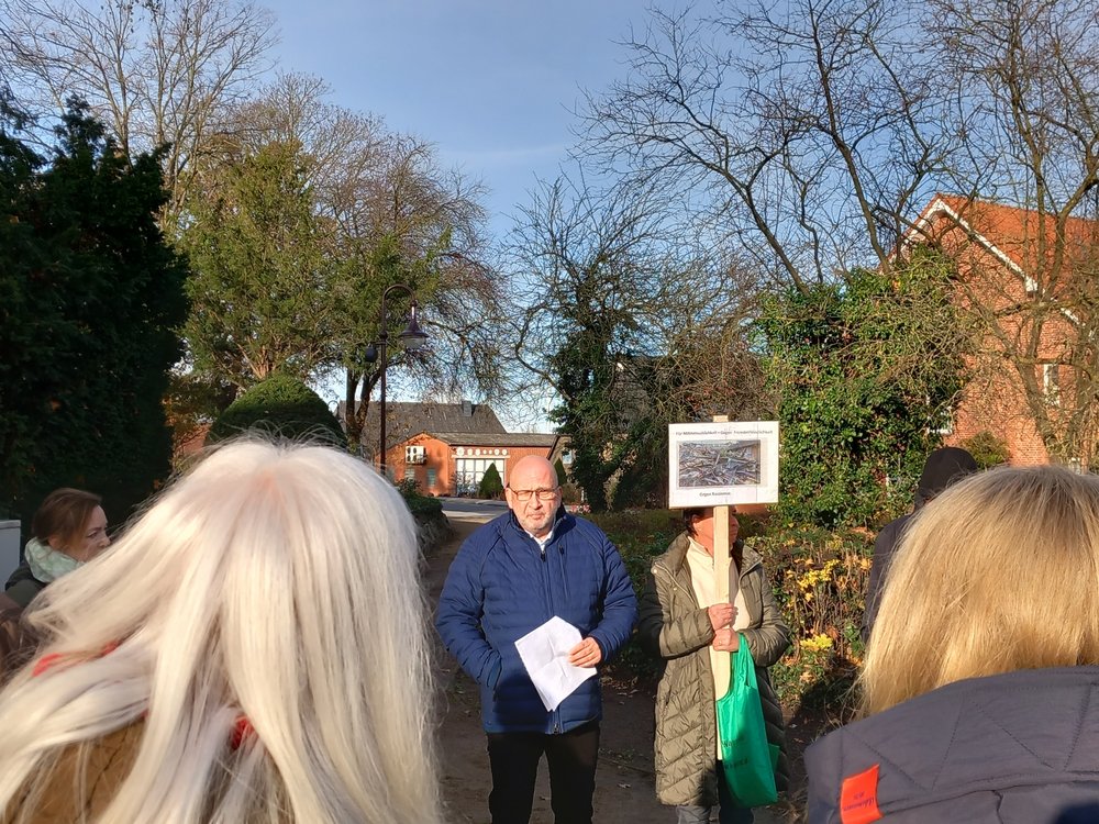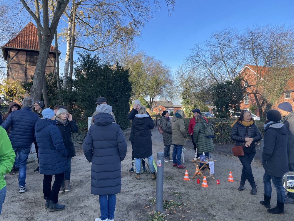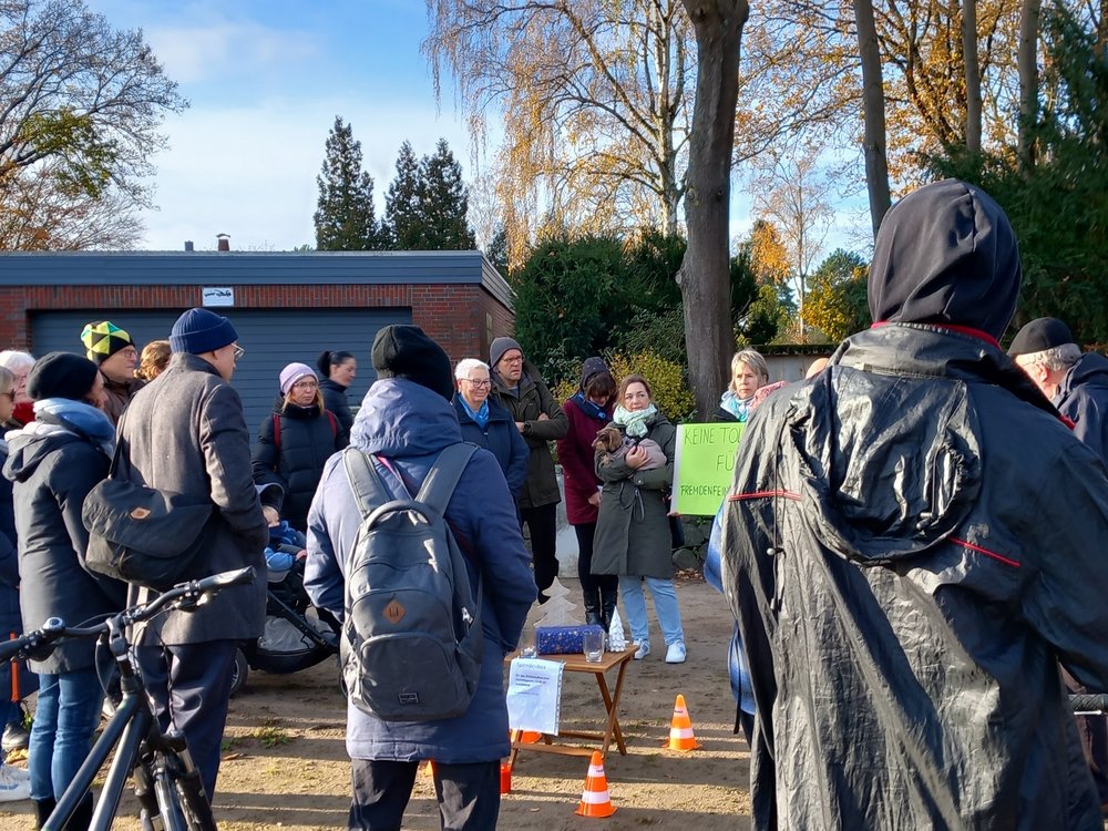 Der ging dann am frühen Nachmittag noch weiter an der Brandruine in Wittorf. Dort trotzten sogar über 150 Menschen der Novemberkälte und zeigten ihre Solidarität mit Geflüchteten und mit der Gemeinde Wittorf, die mit einem großen Banner „Nein zu Hass und Hetze“ sagte. Zu dieser zweiten Mahnwache hatten die Lüneburger Seebrücke, der DGB, die SPD, die Linke und natürlich die Grünen gemeinsam aufgerufen.