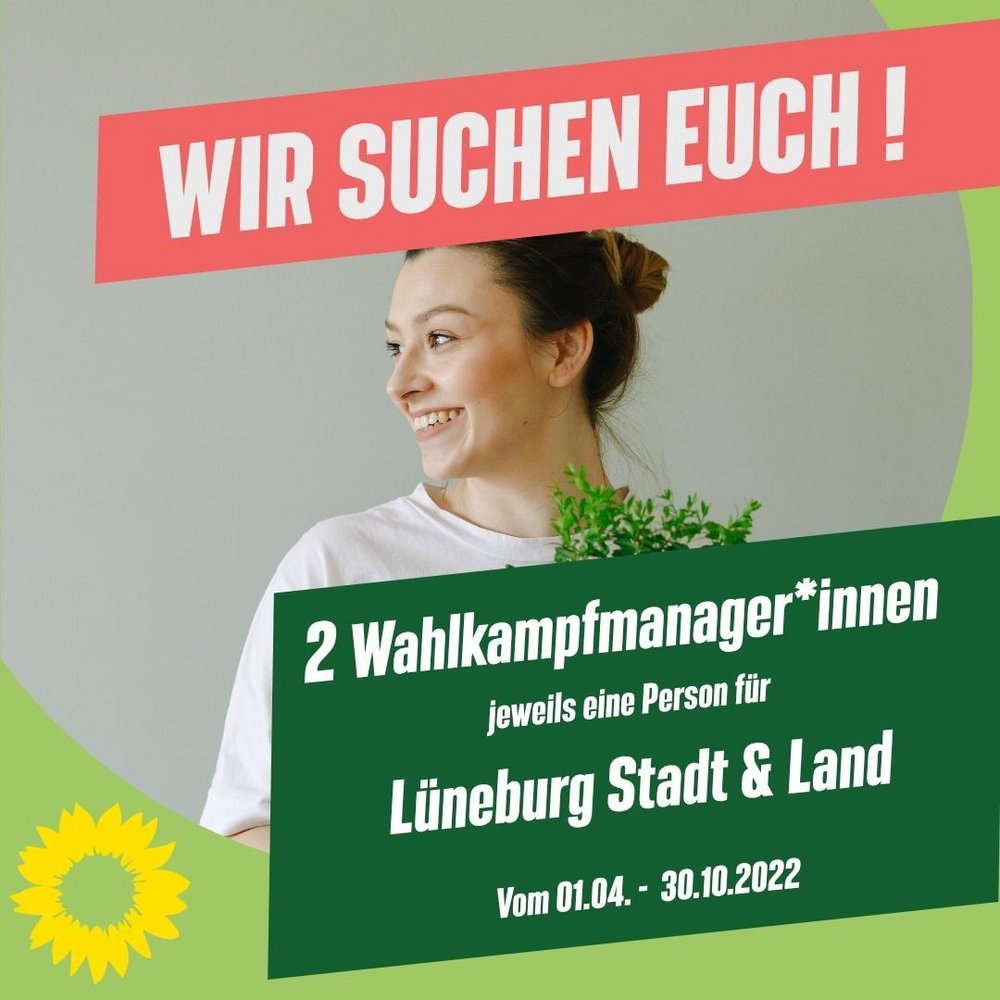 weil wir die Arbeitslast für den/die Wahlkampfmanager*in reduzieren wollen und die Ausgangssituation in den Wahlkreisen Lüneburg Land und Stadt sehr unterschiedlich ist, haben wir uns entschieden, ZWEI Wahlkampfmanager*innen anzustellen. Eine Person ist für Lüneburg Land und eine für Lüneburg Stadt zuständig. Die grundsätzlichen Aufgaben bleiben die gleichen, nur sind die Strukturen in den zwei Wahlkreisen sehr unterschiedlich.