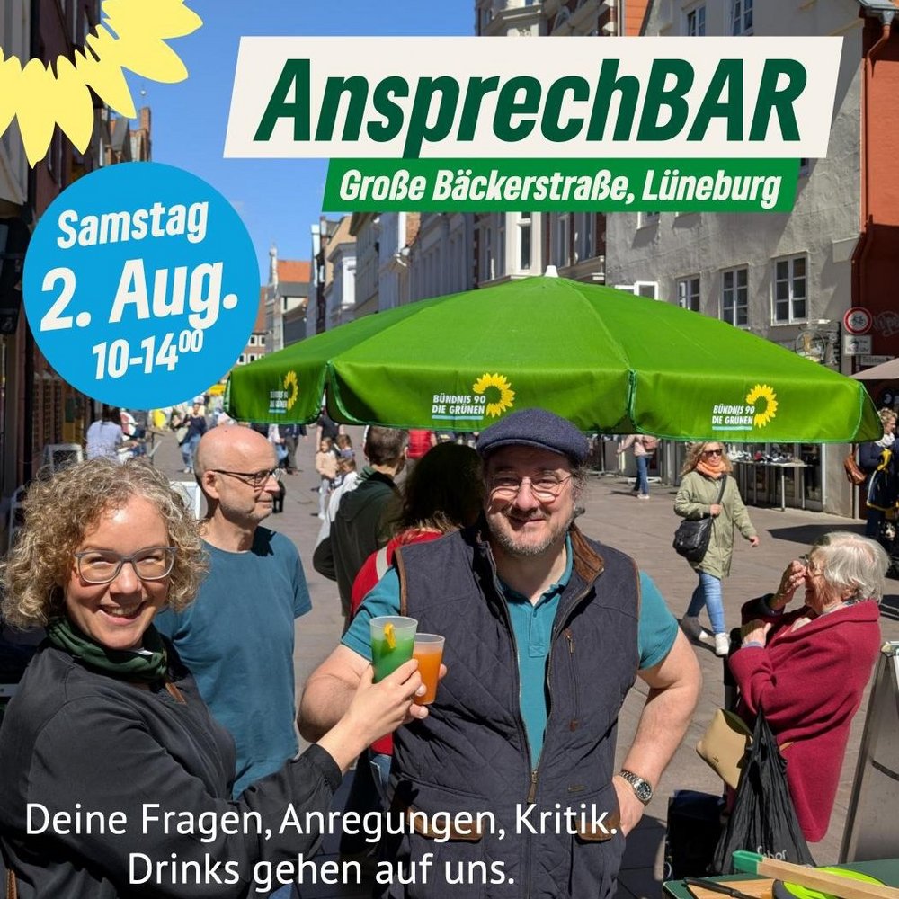 Für alle die nicht mehr, noch nicht oder schlicht gar nicht im Urlaub sind: Am kommenden Samstag sind wir wieder mit unserer AnsprechBAR in der Großen Bäckerstraße in Lüneburg ansprechbar. Dort gibt es, wie gewohnt, unsere leckeren alkoholfreien Cocktails 🍹 und Gelegenheit auf einen Schnack, z.B. mit JuliaVerlinden. Kommt vorbei! 💚🌻