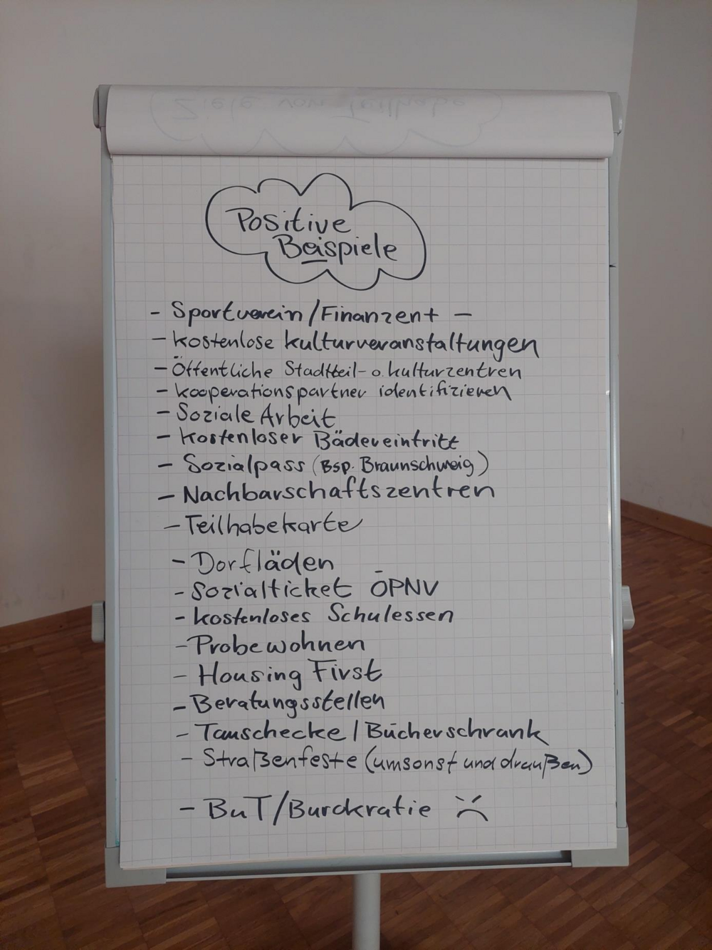 Wir schauten weiter nach „blinden Flecken“ bei uns selbst und stellten fest, dass jede*r von uns von Armut betroffene Menschen kennt (Familienmitglieder, Nachbar*innen, Freund*innen, Kommiliton*innen). Wir sprachen über die Chancen und Bedingungen von Teilhabe, sammelten positive Beispiele und überlegten, was es einigen Menschen schwer macht, nachbarschaftliche Angebote zu nutzen. Wiederkehrende Begriffe waren „Einsamkeit“ und „Scham“. Dabei wurde auch das eine oder andere Vorurteil auf den Prüfstand gestellt. Kann ich meine eigene Erfahrung ohne weiteres auf andere übertragen? Schließlich überlegten wir, wie unseren Mitmenschen mehr Teilhabe ermöglicht werden könnte. Wer mit uns gemeinsam weiterdenken und sich für eine nachhaltige Veränderung einsetzen möchte, ist herzlich zu den Treffen der AG Soziales und Gesundheit eingeladen, die an jedem zweiten und vierten Dienstag eines Monats von 20:00 – 21:30 Uhr im Grünen Büro stattfinden.