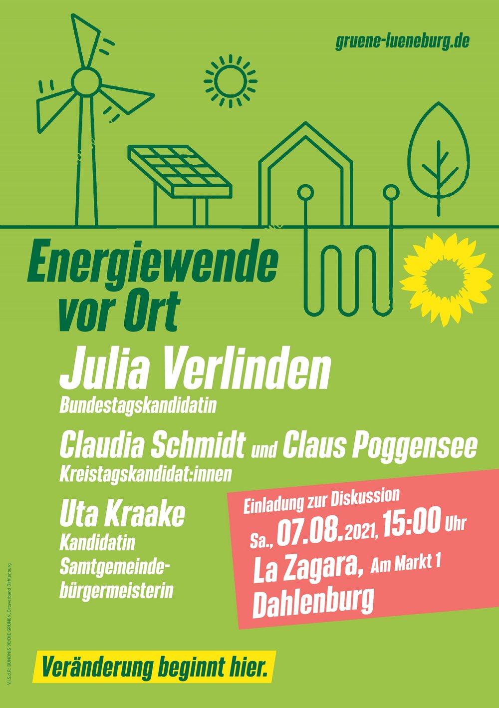 Die Direktkandidatin für den Wahlkreis Lüchow-Dannenberg–Lüneburg, Julia Verlinden (GRÜNE), wird ihre Vorstellungen zur notwendigen Energiewende erläutern. Gemeinsam mit den Kreistagskandidat:innen Claudia Schmidt und Claus Poggensee wird sie sich den Fragen interessierter Bürger stellen und die vielfältigen Möglichkeiten und damit verbundenen Chancen für die Samtgemeinde Dahlenburg und den Ostkreis diskutieren.