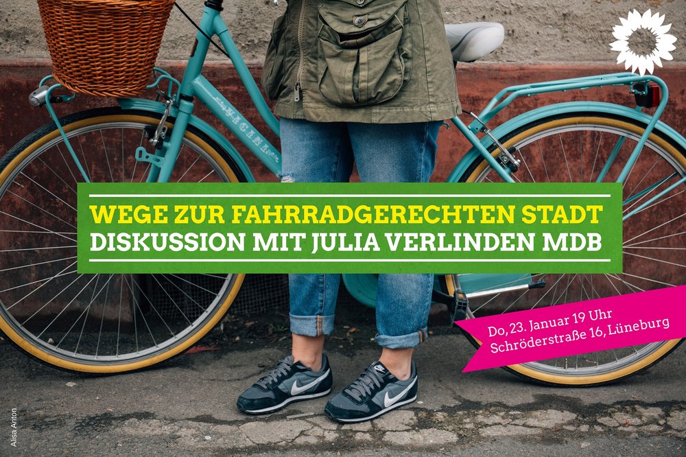 Auf Einladung der grünen Bundestagsabgeordnete Julia Verlinden sollen gemeinsam mit Referierenden und Publikum diese Fragen diskutiert und eine Vision für die Zukunft des Fahrrads in Lüneburg entwickelt werden. Mit dabei sind u.a. Katharina Rosch von der Initiative „Fahrradstadt Braunschweig“, die dort einen Radentscheid vorbereitet, und die AG Mobilität der Lüneburger Grünen.