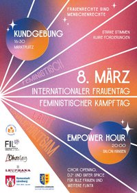 16:30 Uhr: Kundgebung auf dem Marktplatz – "Frauenrechte sind Menschenrechte – starke Stimmen, klare Forderungen“. Intersektionale Perspektiven auf den Weltfrauentag.