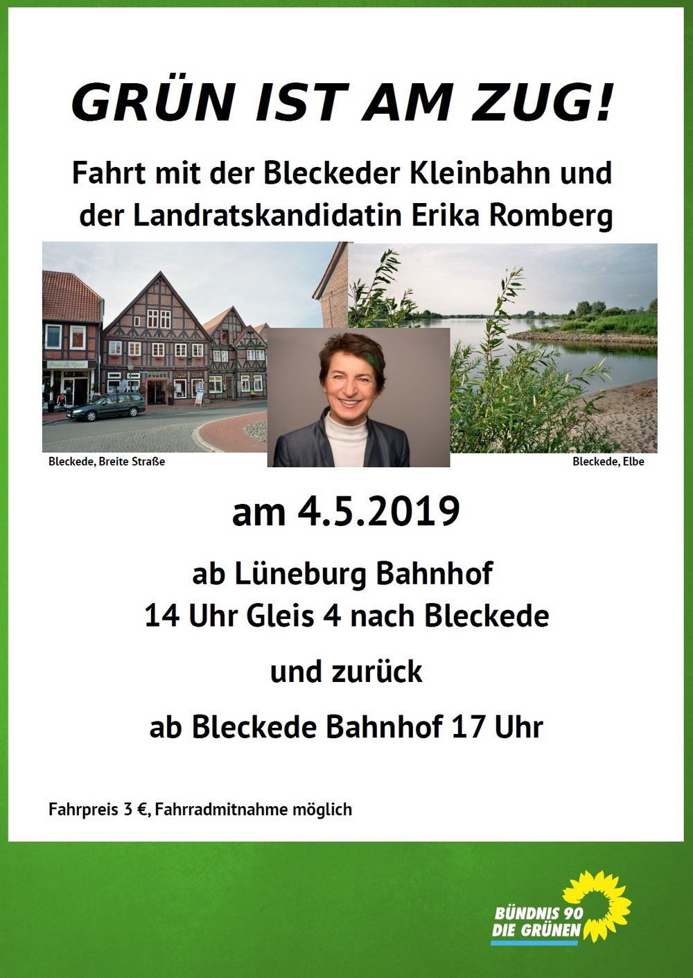 Erika Romberg, die Landratskandidatin für den Kreis Lüneburg, wird zu diesem Anlass der „Grünen Sonderfahrt“ mit der Bleckeder Kleinbahn am Samstag, den 04.05.19 vom Lüneburger Bahnhof um 14.00 Uhr von Gleis 4 in Richtung Bleckede mitfahren. Für 3 Euro pro Person und Fahrt kann diese Gelegenheit gerne zum Mitfahren genutzt werden. Wir wollen die Strecke zu dieser Gelegenheit bewusst nutzen, da wir sie in Zukunft gerne wieder in regelmäßigen Betrieb genommen sehen würden.