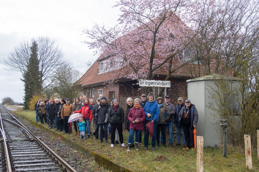 Auf Anregung der Betzendorfer Grünen-Fraktion trafen sich mehr als 30 Einwohner*innen trotz Wind und Regen aus Betzendorf, Drögennindorf, Glüsingen und Tellmer, um für die Einrichtung des Bahnhalts an der Kreisstraße zwischen Drögennindorf und Betzendorf zu stehen.