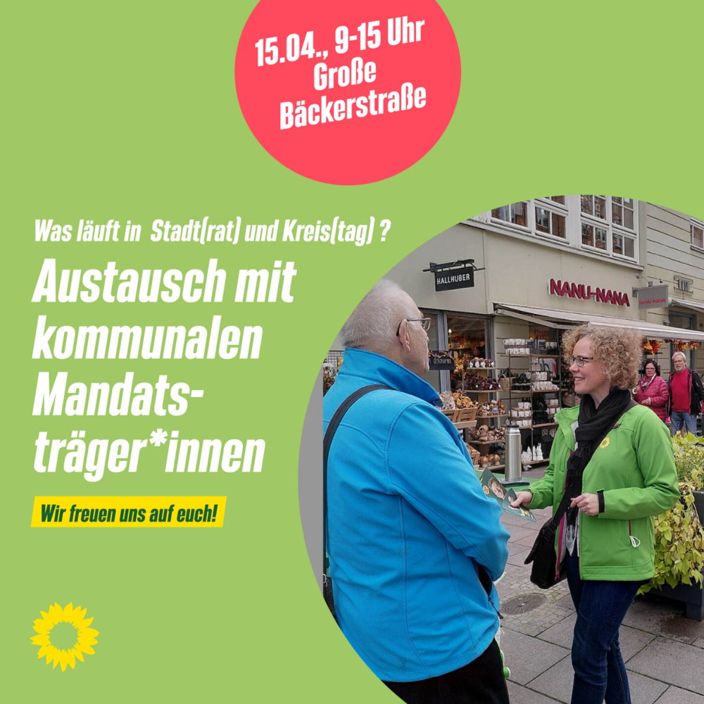 Am 15.04.2023, von 9 - 15 Uhr, stellen sich in der Bäckerstraße, auf der Höhe von Juwelier Süpke, die kommunalen Mandatsträger*innen aus Kreis und Stadt bereit, um ins Gespräch zu kommen über das, was gerade in den Gremien diskutiert wird, das wären zum Beispiel soziale Wohnraumpolitik in der Stadt oder die Mobilitätsgesellschaft im Landkreis. Vor allem auch über die Themen, die Menschen hier im Landkreis bewegen und die vielleicht noch nicht ausreichend Beachtung finden.