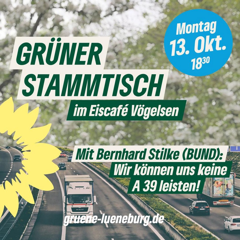 Die Grünen aus Radbruch und die Grünen aus Vögelsen laden Mitglieder und Interessierte am 13. Oktober 2025 zu unseren nächsten grünen Stammtisch um 18.30 Uhr ins Eiscafe Vögelsen ein. Gast ist Bernhard Stilke (BUND) zum Thema: Wir Können Uns Keine A39 Leisten! Als Ausnahme machen wir hier einmal Bundespolitik.