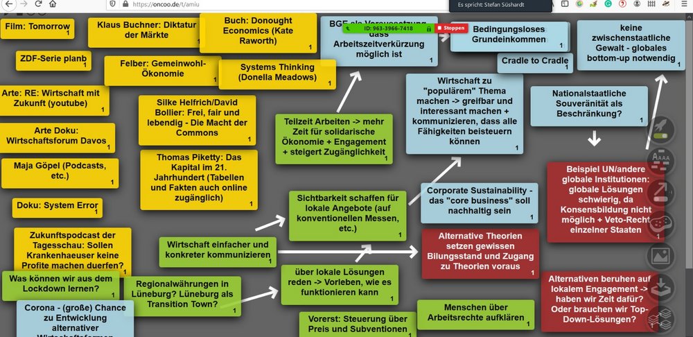 In kleinere Gruppen aufgeteilt waren anschließend die Teilnehmenden an der Reihe: Egal ob lokale oder globale Lösungen und Visionen, Medien-Tipps zur Weiterbildung zum Thema alternatives Wirtschaften, oder auch Gedanken zu den zuvor vorgestellten Theorien – alles war erwünscht und wurde auf einer virtuellen Tafel zusammengetragen. Neben viel Lesefutter und einigen Doku-Tipps wurde zum einen oft auf den Faktor Arbeit und Arbeitszeit, sowie das Bedingungslose Grundeinkommen als Grundlage für ein freieres Leben und mehr Zeit für Engagement und Eigenproduktion, eingegangen. Doch was bringen all die Ideen, wenn keine*r davon weiß?