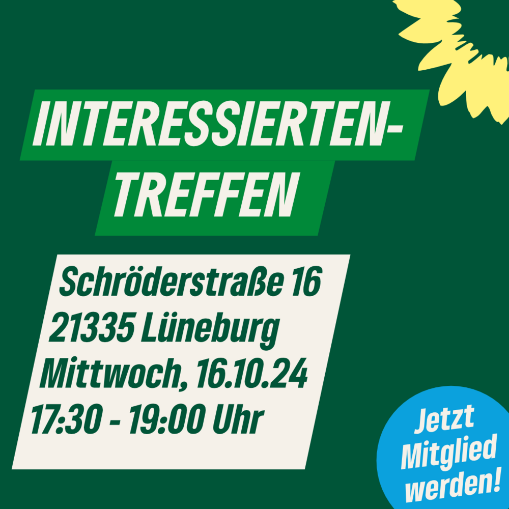 Mittwoch, 16.10.2024 von 17:30 - 19:00 Uhr im Grünen Büro in der Schröderstraße 16 (Hof) in Lüneburg