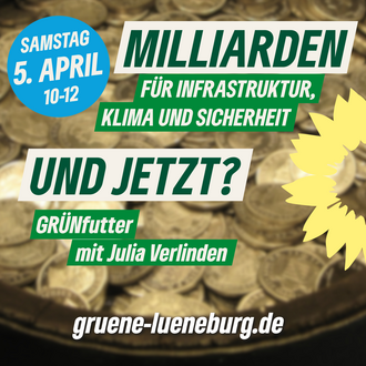 Wir wollen mit Euch und Julia Verlinden analysieren und diskutieren, wie es nun weitergehen muss und wie grüne Politik auch aus der Opposition heraus funktioniert. Beim GRÜNFutter. Am 5. April um 10:00. Im Grünen Büro in Lüneburg.