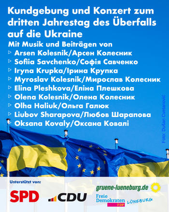 In Lüneburg wird am Abend des 24. Februar der Zigtausenden Opfer und Millionen Vertriebener und Geflüchteter des russischen Angriffskrieges mit einer Kundgebung und Konzert gedacht. Um 18 Uhr auf dem Marktplatz vor dem Rathaus treten ukrainische Künstlerinnen und Künstler auf die Bühne, um in Liedern, Gedichten und (zweisprachigen) Reden aus und über die Ukraine, die Trauer, die Kraft und die Hoffnung der Menschen zu sprechen und zu singen.