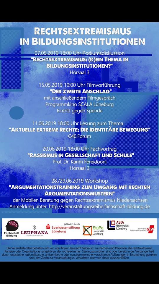 Am 11.06.2019 um 18:00 Uhr findet eine Lesung mit anschließender Diskussion zum Thema „Aktuelle (extreme) Rechte: Die Identitäre Bewegung und völkische Siedler*innen“ von Andreas Speit und Andrea Röpke im Forum des Zentralgebäudes der Leuphana (C40.Forum) statt.