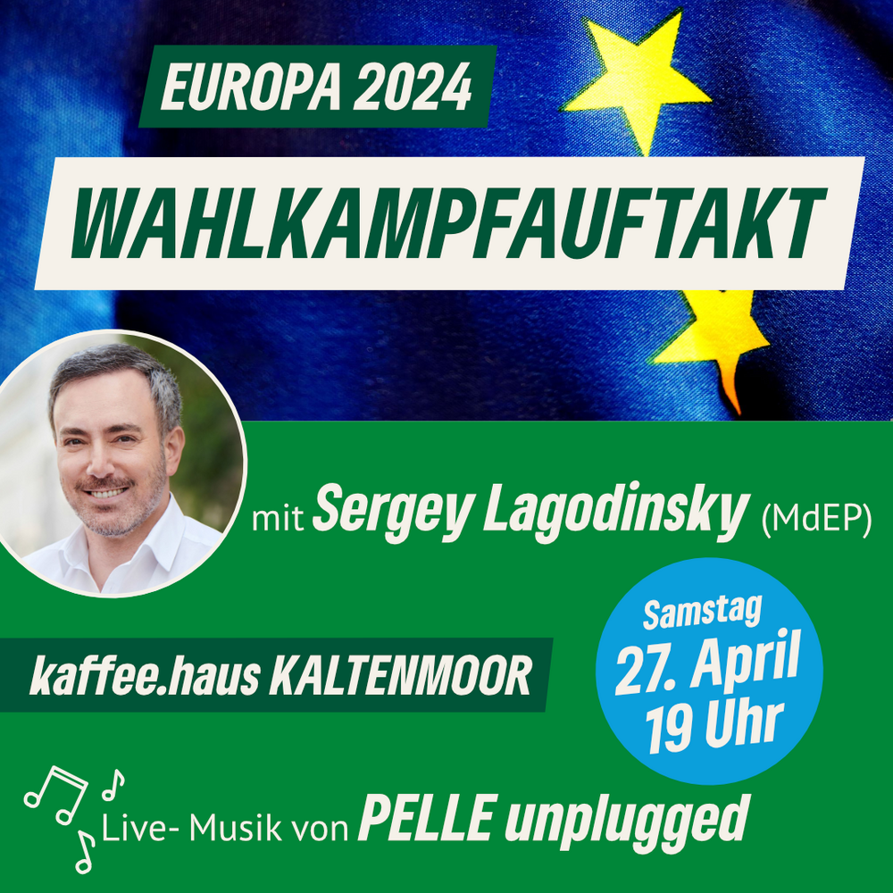 Mit einem Europaabend im kaffee.haus Kaltenmoor am Samstag, dem 27. April um 19 Uhr eröffnen die Grünen Lüneburg die "heiße Wahlkampfphase". Mit dabei sein wird der EU-Abgeordnete und grüne Spitzenkandidat Sergey Lagodinsky.