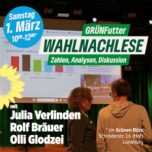 Was sind die Gründe? Und was folgt nun aus den Ergebnissen? Beim GRÜNFutter am Samstag, dem 1. März haben wir uns das gemeinsam mit über 30 Besucher*innen angeschaut. Mit dabei unsere Bundestagsabgeordnete Julia Verlinden, sowie Rolf Bräuer und Olli Glodzei aus dem Kreisvorstand.