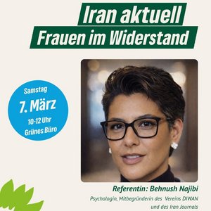 An diesem Samstag laden wir wieder zu einem GRÜNfutter ein. Diesmal haben wir als Referentin Behnush Najibi gewinnen können. Es geht aus aktuellem Anlass über die Rolle der Frau im iranischen Widerstand. Behnush Najibi ist Psychologin, Mitbegründerin des Vereins DIWAN und des Iran Journals.