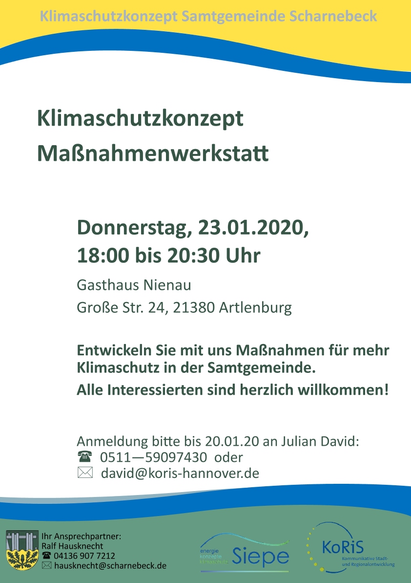 Um die KIima-Maßnahmenwerkstatt gut vorbereiten zu können, wird um eine kurze Anmeldung möglichst bis zum 20.01.2020 beim Büro KoRiS (david@koris-hannover.de oder Tel.: 0511/590974-30) oder bei der Samtgemeinde Scharnebeck, Ralf Hausknecht (hausknecht@scharnebeck.de, TeI.: 04136/907-7212) gebeten.