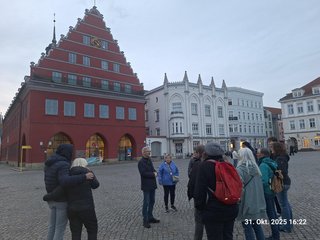 Am Ende einer nicht ganz reibungslosen, aber letztendlich unkomplizierten Bahnfahrt über Berlin sind wir am frühen Nachmittag in Greifswald eingetroffen, wo uns unsere Freunde und Freundinnen vom KV Vorpommern-Greifswald zu einer ganz besonderen Stadtführung mit und durch den Oberbürgermeister Stefan Fassbinder eingeladen haben.