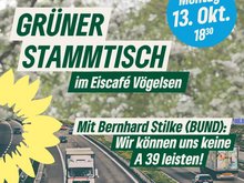 Die Grünen aus Radbruch und die Grünen aus Vögelsen laden Mitglieder und Interessierte am 13. Oktober 2025 zu unseren nächsten grünen Stammtisch um 18.30 Uhr ins Eiscafe Vögelsen ein. Gast ist Bernhard Stilke (BUND) zum Thema: Wir Können Uns Keine A39 Leisten! Als Ausnahme…